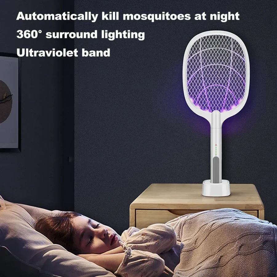 This USB-rechargeable mosquito swatter delivers 3000V instant zapping power with a purple LED lure. Features 3-layer safety mesh and doubles as night light/baby sleep protector. Charges in 2-4 hours via USB (100-240V compatible).